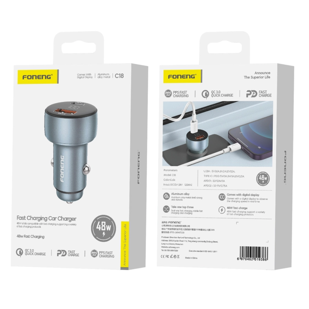 Prodotto CompatibileCaricabatteria da auto 2 porte USB e Type-C FONENG C18 48W PD QC 3.0 silver.